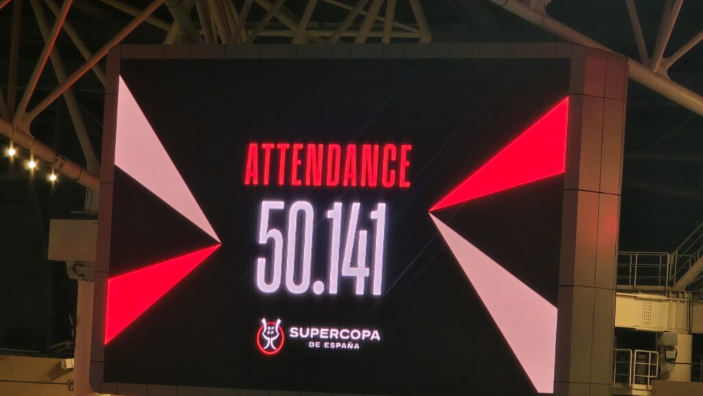 يعلن المذيع الداخلي أن عدد الحضور الجماهيري تجاوز 50 ألف مشجع.